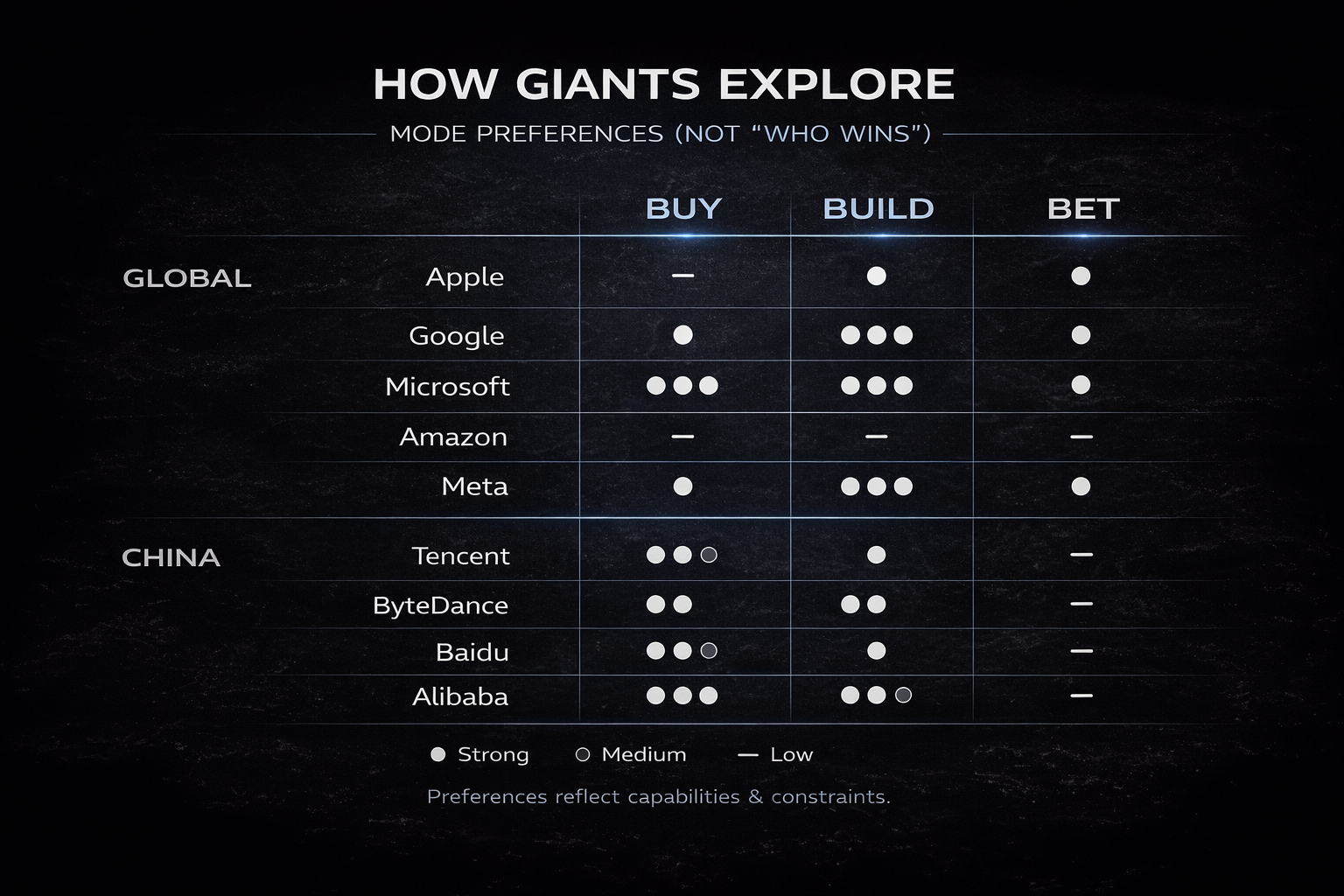共性与差异共性是所有巨头都在用 Buy/Build/Bet 去应对入口迁移、组织惯性与边界压力。