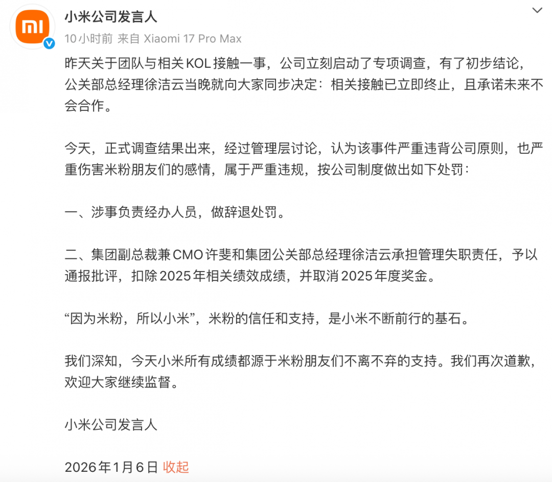【TechWeb】1 月 7 日消息,昨日晚间,据小米公司发言人官方微博消息,昨天关于团队与相关 KOL 接触一事,公司立刻启动了专项调查,有了初步结论,公关部总经理徐洁云当晚就向大家同步决定:相关接触已立即终止,且承诺未来不会合作。