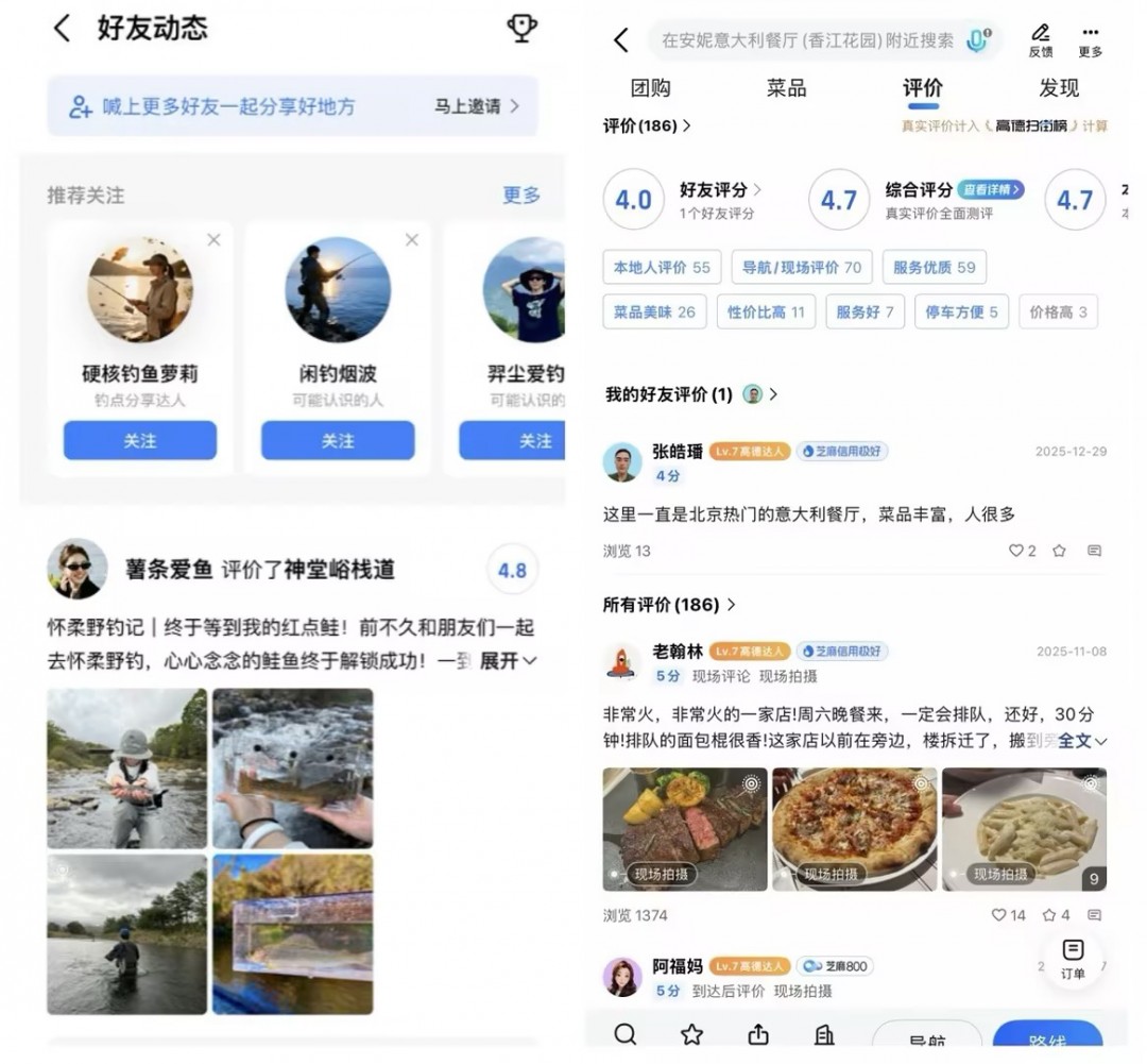 「好友动态」 功能则是用户在浏览榜单时,可优先查看好友对商户的评分、评价及公开发布的地点动态。相比陌生人的平均分,来自熟人的亲身反馈更具参考价值,也让榜单更有温度、更值得信赖。
