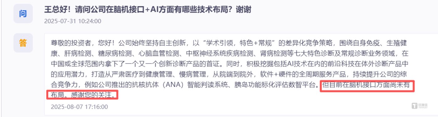 最为关键的是,公司态度的戏剧性反转,精准踩中了概念炒作的时间点。回溯 2025 年 8 月,有投资者在互动平台询问亚辉龙在脑机接口领域是否有布局。公司当时的回复明确而干脆:「目前在脑机接口方面尚未有布局。」