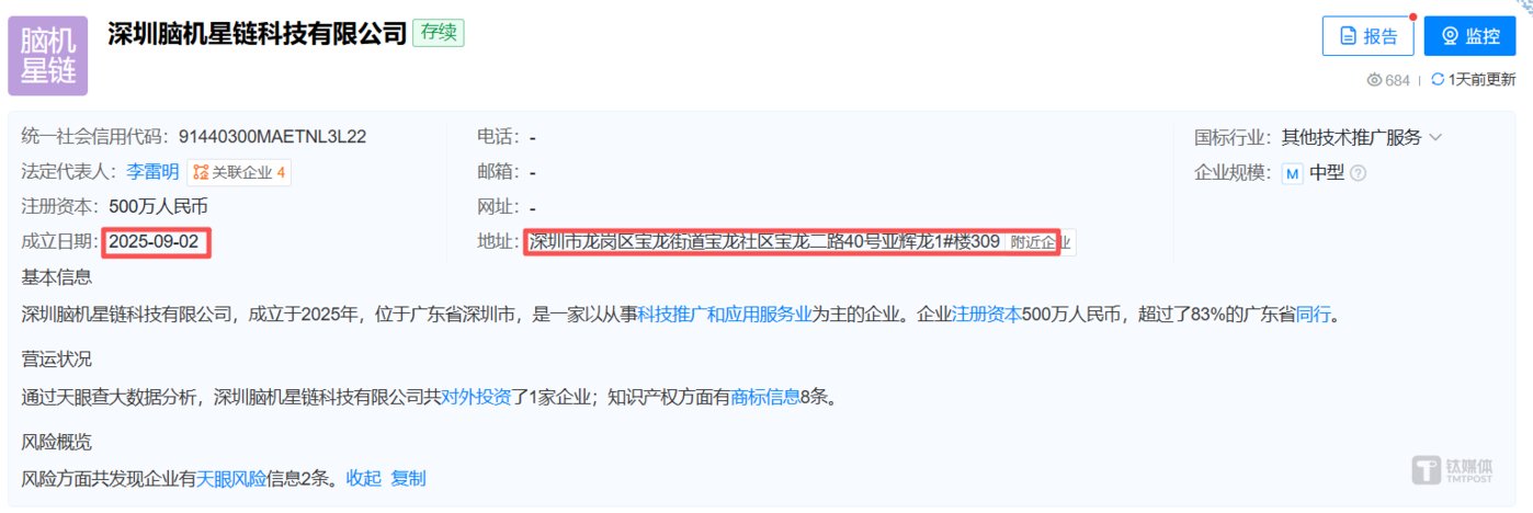 首先,合作方的资质与背景迷雾重重。根据公开信息,此次的战略合作方脑机星链,成立于 2025 年 9 月 2 日。从成立之日到签署战略协议,其间仅隔四个月。