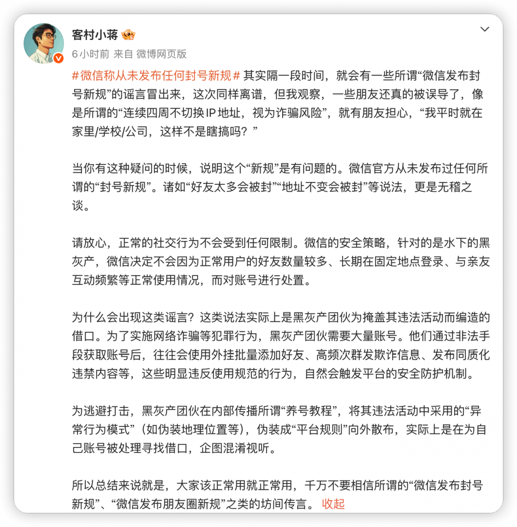 客村小蒋指出,每隔一段时间就会有一些所谓 「微信发布封号新规」 的谣言冒出来,这次同样离谱,相关说法均为无稽之谈。