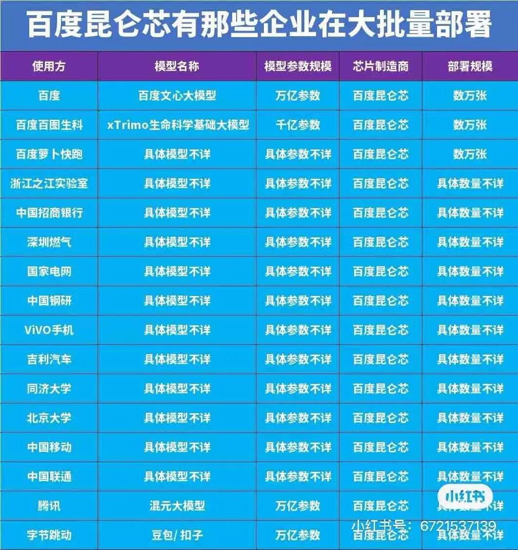 从中长期来看,昆仑芯的领跑地位有望进一步巩固。百度的全栈 AI 布局为它提供了独特的生态壁垒—— 昆仑芯与飞桨框架、文心大模型的深度协同,能为客户提供“ 芯片-框架-模型-应用” 的一体化解决方案,这种协同优势是摩尔线程等纯硬件厂商难以复制的。