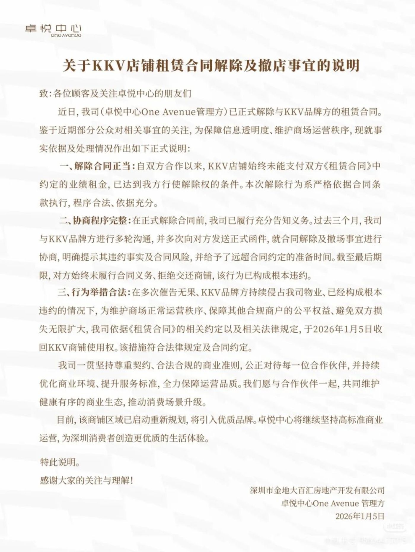 2025 年 9 月,卓悦中心首次提出调整方案,建议 KKV「退回负一层、保留一楼部分区域」。2025 年 11 月,双方管理层举行会谈,卓悦中心提出具体缩铺移位方案。因 KKV 业绩持续不达标触发合同相关条款,卓悦中心正式发出 《解约公函》。