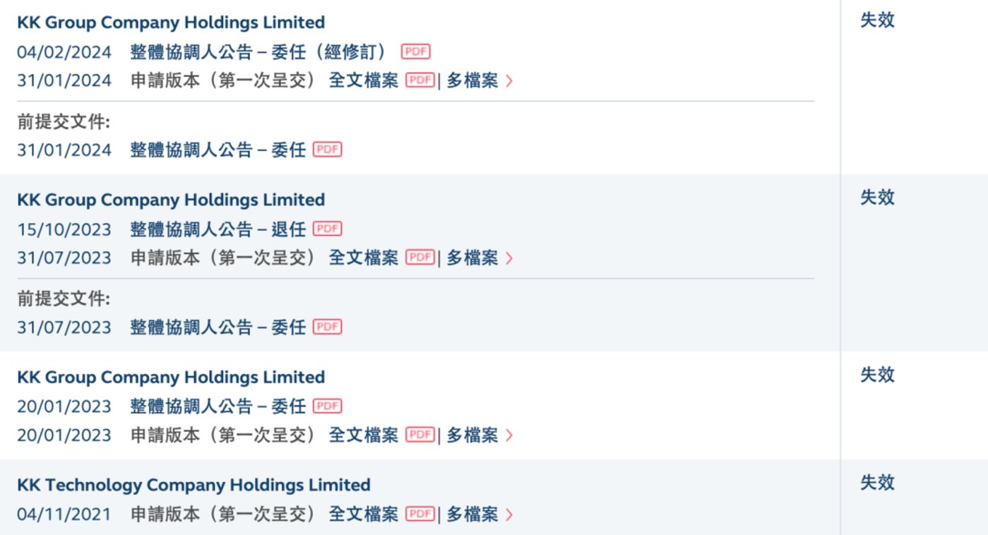 概念看似引人,但 KK 集团的资本之路却并不顺畅。自 2021 年首次向港交所递交招股书以来,KK 集团已四次冲刺上市。2024 年 1 月 31 日,KK 集团第四次提交 IPO 申请,但目前其招股书已失效。