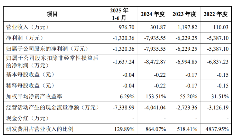 据招股书,2022-2024 年以及 2025 年上半年,该公司营收分别约 110.03 万元、1197.82 万元、301.87 万元、976.7 万元;归属净利润分别为-5387.1 万元、-6229.25 万元、-7935.55 万元和-1320.36 万元。截至 2025 年 6 月末,合并报表层面累计未弥补亏损约 3.46 亿元。