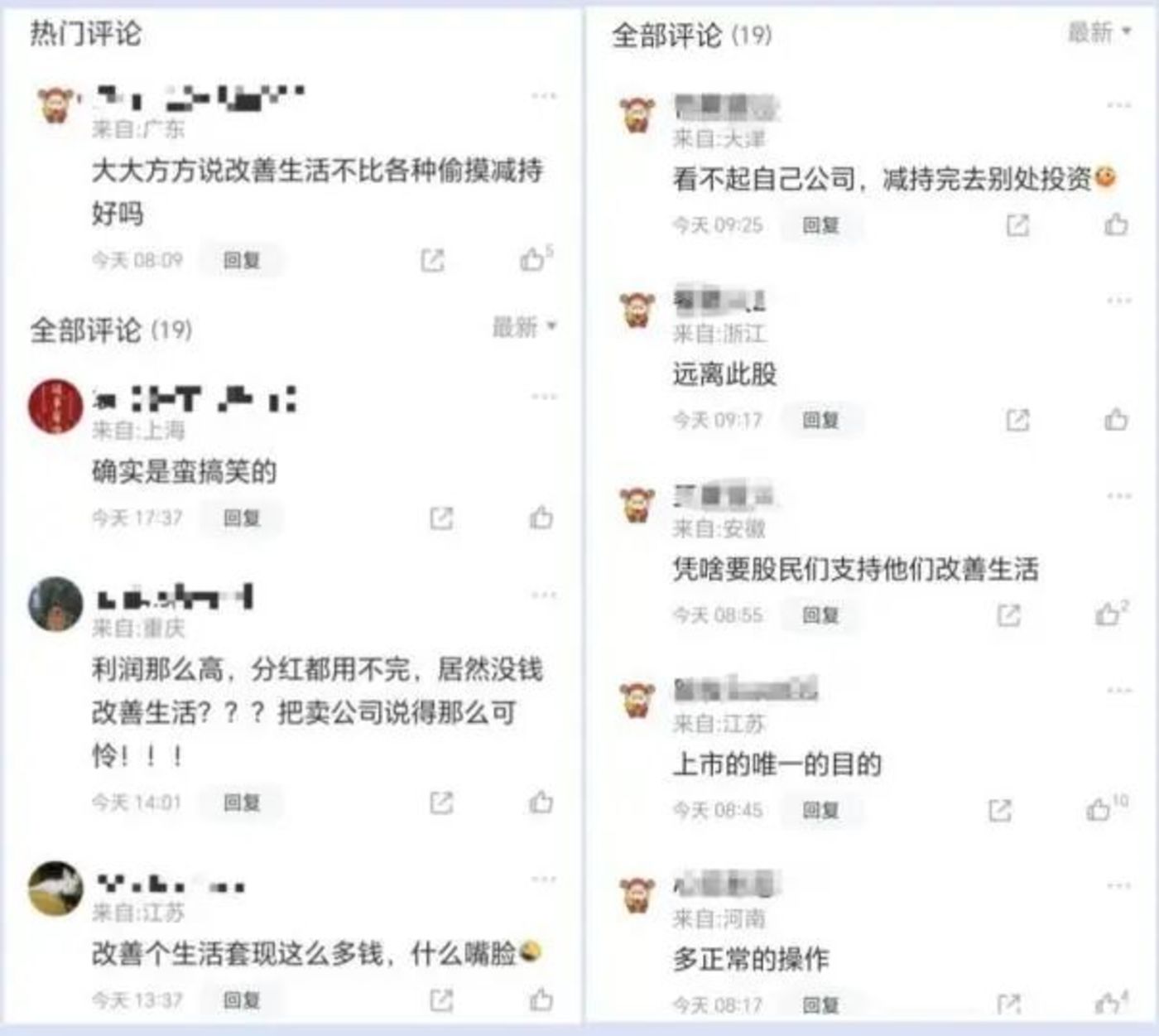 减持公告发布后,很快引来了投资者们的关注。有投资者在其股吧质疑,「分红都用不完,居然没钱改善生活?」「不投资自己公司,减持完去别处投资。」 也有投资者对这一行为表示理解,认为股东减持是正常操作。