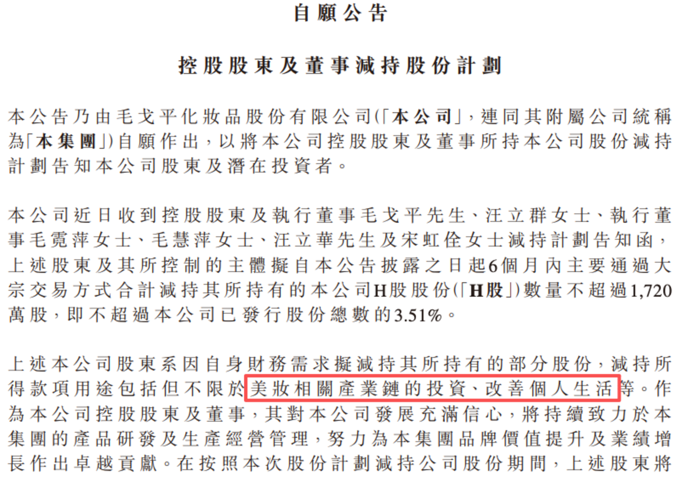 公告显示,上述董事因 「自身财务需求」 减持股票,所得款项将用于美妆相关产业链的投资、改善个人生活等用途。公司也强调,控股股东及董事对公司发展充满信心,将持续致力于产品研发及生产经营管理,努力为品牌价值提升及业绩增长作出卓越贡献。