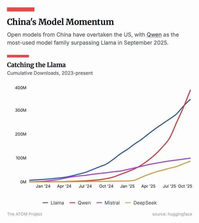 Hugging Face 监测数据显示,中国开源模型的全球下载量份额首次反超美国,其中阿里巴巴的千问系列长期蝉联榜首