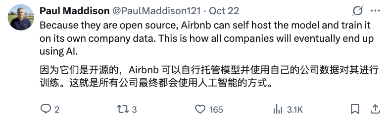 如今,这种“C 端带动 B 端” 的效应已经凸显:在硅谷,Airbnb、苹果、亚马逊等巨头都在使用 Qwen 模型,Airbnb CEO 布莱恩· 切斯基甚至公开表示“ 公司大量依赖 Qwen 模型,因其性能优于 OpenAI 模型更快更好。”