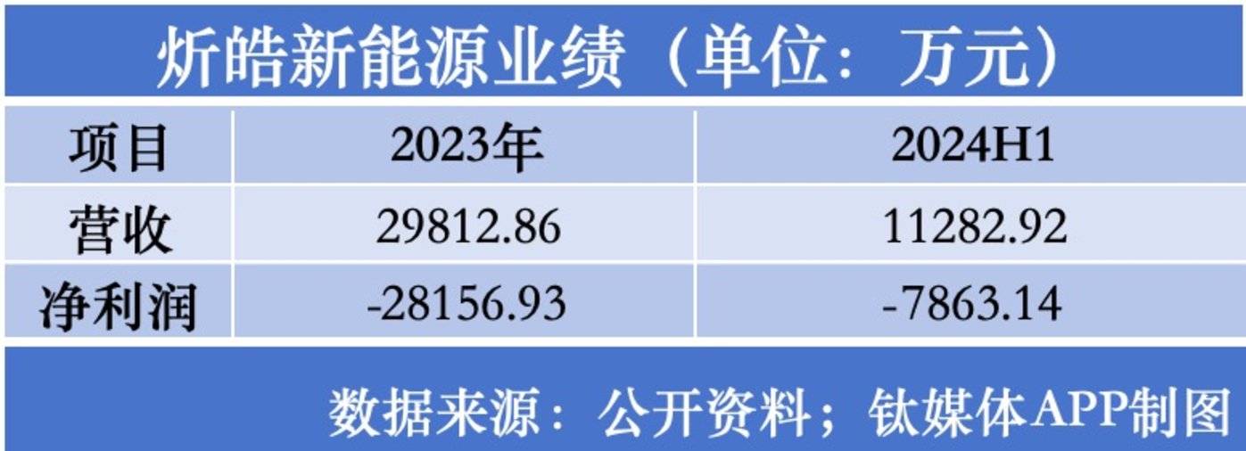 定期报告披露,2023 年、2024H1,炘皓新能源分别实现营收 2.98 亿元、1.13 亿元,净利润分别亏损 2.82 亿元和亏损 0.79 亿元。