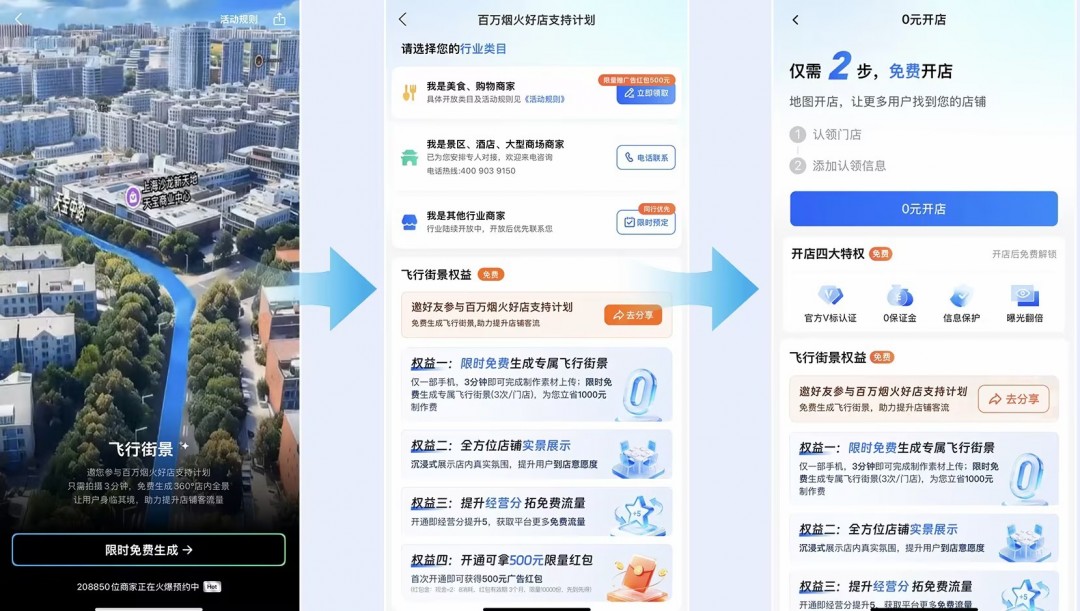 昨日,高德发布全面升级的高德扫街榜,并启动 「百万烟火好店支持计划」,宣布将投入价值数亿元的算力资源,为 100 万商家免费接入 「飞行街景」。