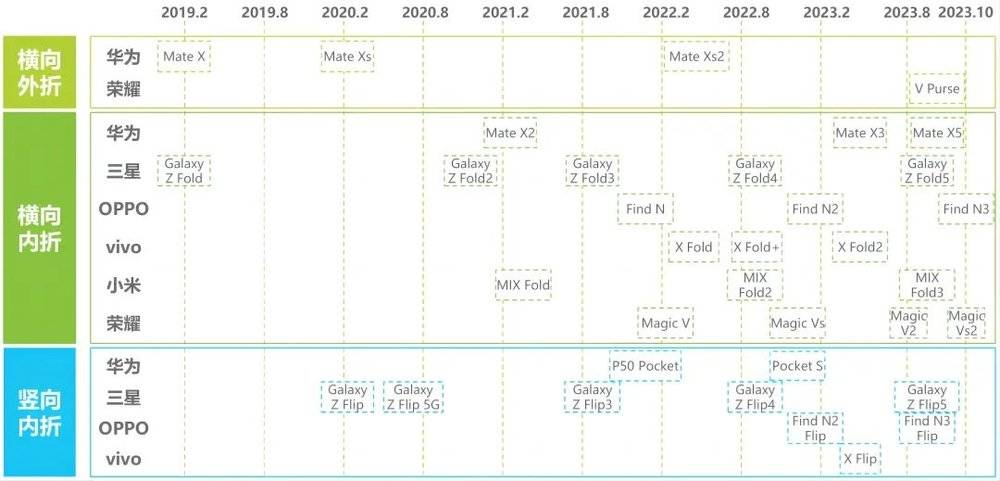 OPPO、vivo 和小米,也属于第二梯队。它们与荣耀类似,多在 2021-2022 年间才发布首款折叠屏产品。此后,它们每年更新 1-2 款,且只有内折和竖折产品,相对保守。