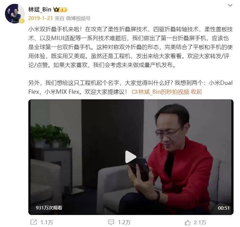 1 月 23 日午后,小米联合创始人兼时任总裁林斌在微博上发布了一个视频,宣布小米攻克了柔性折叠屏技术、四驱折叠转轴技术、柔性盖板技术等一系列难题后,做出第一台双折叠手机。他特意声明,这是一台工程机,只是发出来给大家看看,将会根据大家的喜爱程度考虑是否做成量产手机。