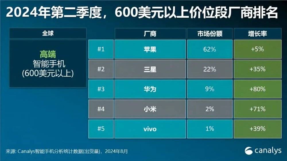 研究机构 Canalys 数据显示,2024 年二季度,全球高端智能手机市场 (600 美元以上)出货量前五的厂商均实现了同比增长。苹果、三星、华为分别以 62%、22%、9% 的市场份额位居前三。