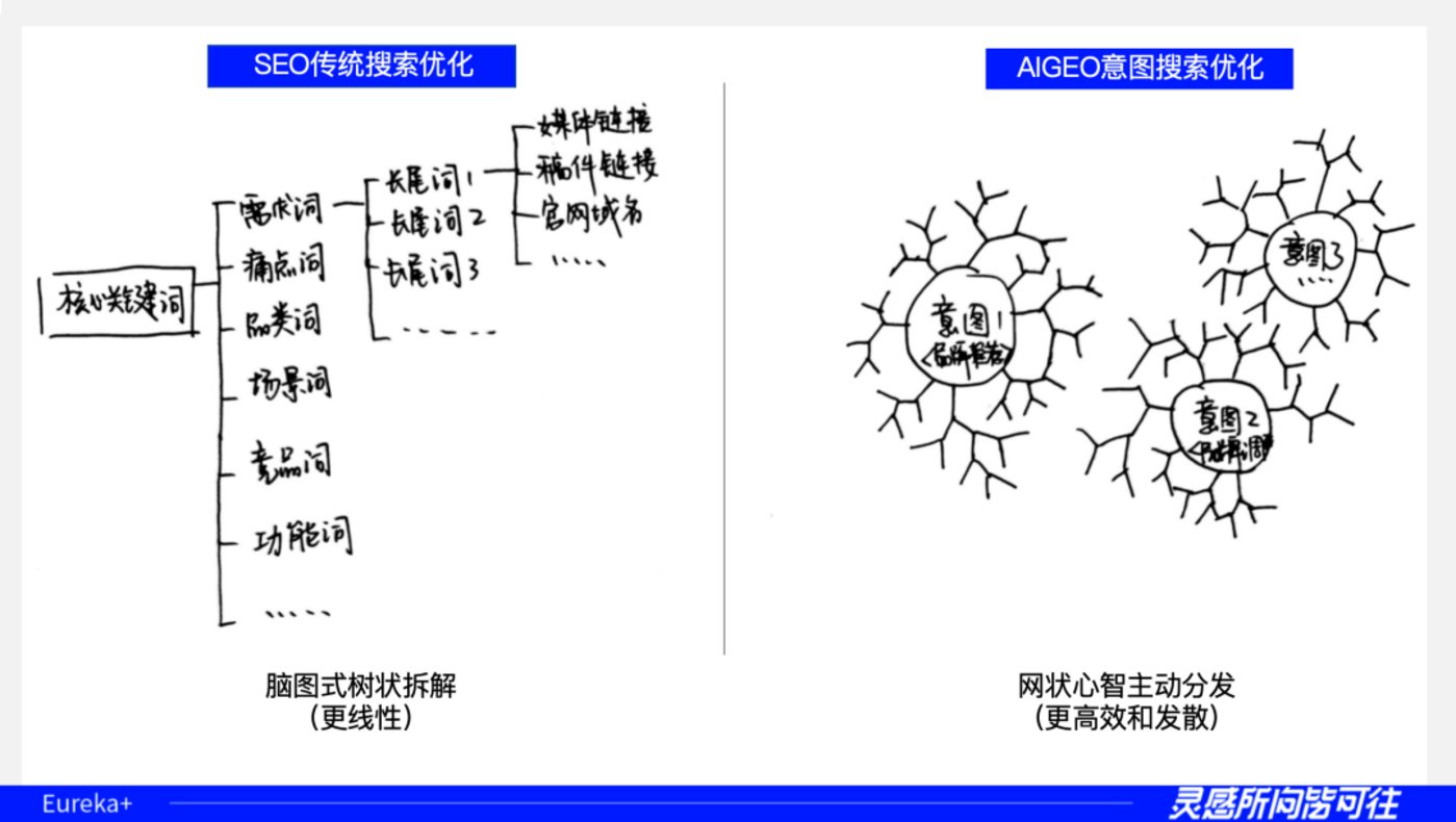 SEO 是树状结构,是从核心搜索关键词延伸到长尾词,再对应到具体的媒体文章或域名链接的线性呈现。然而,AI 之所以被称为 「人工智能」,在于它有 「智」——它可以进行复杂的决策判断,并拥有自由生长的心智。因此,GEO 是网状结构。品牌和产品要解决的,是 「独立意图」 下 AI 对你的记忆。只要让 AI 看见你、理解你、记住你,你的品牌就能有无数种可能性,被 AI 主动推荐给那些需求千变万化的消费者。
