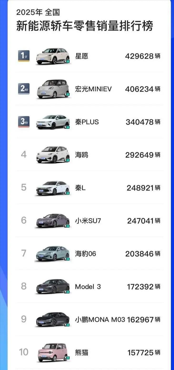 要知道,2025 年的报废国补催生了几个超级爆款车型:吉利星愿,五菱宏光 miniEV 和比亚迪秦 PLUS 和海鸥。