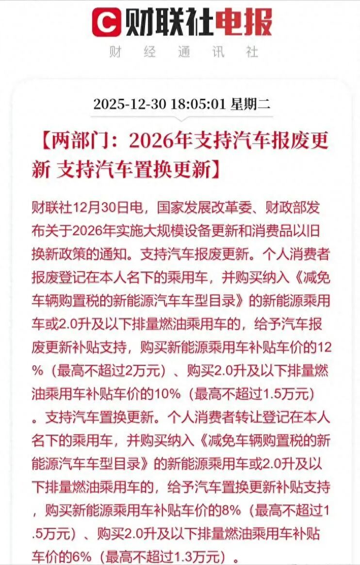 综上来看,2026 年新国补一出,汽车市场或迎来变局,想拿 2 万元的新能源报废补贴,车辆价格大约在 16.7 万元上下,如果想要获取满 1.5 万的燃油车报废补贴,车辆价格得达到 15 万上下。