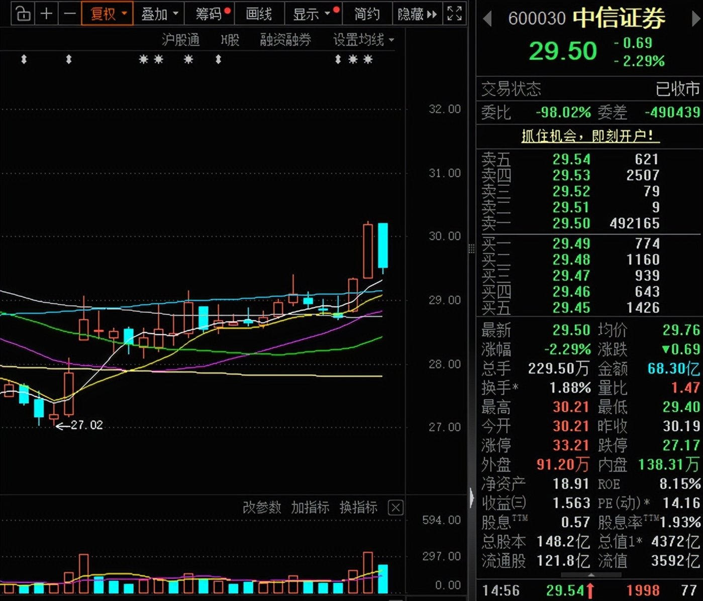 其中,中信证券 A 股 「卖一」 位置出现一笔 49.22 万手的巨额卖单。以中信证券当天 29.50 元/股收盘价计算,这部分压单约 14.52 亿元,而当日全天成交额为 68.30 亿元。
