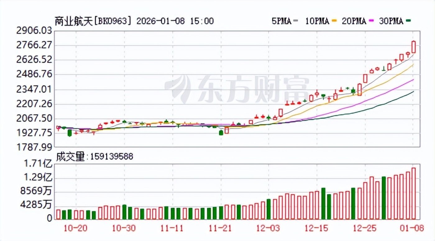 值得提醒的是,虽然上证指数收出 15 连阳,沪深两市成交也维持在 2.8 万亿附近,但是,如前所述,A 股整个行情已经走到半山腰,热门板块更是涨幅较大。比如商业航天板块,自去年 11 月 21 日到今日收盘,累计涨幅 42.42%。