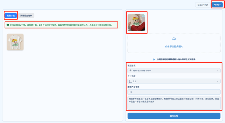 3. 批量提交任务:在界面中选择模型 (支持 Sora2、Nano Banana Pro、gpt image 1.5、Veo 等视频画图模型),上传图片,选择图片尺寸,在文本框内输入提示词 (例如:根据参考图生成一张上衣正面整体展示,根据参考图还原上衣主体图案全貌,纯色背景,柔和自然,突出产品整体形态与图案呈现效果。) 点击生成。