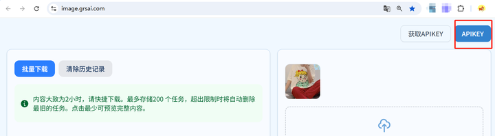 2. 配置密钥:在 image.grsai.com 右上角 APIKEY 中填入。