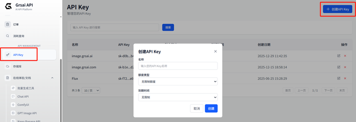 1. 获取 「批发密钥」:在 GrsAI(grsai.com) 官网控制台创建 API Key。