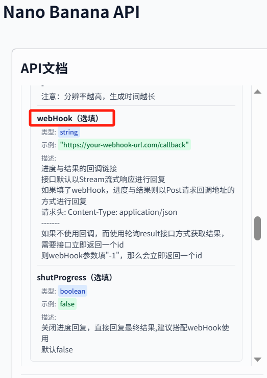 1. 请求参数:设置 「webHook」 为你服务器的回调地址。可搭配 「shutProgress」: true 让回调只发最终结果。