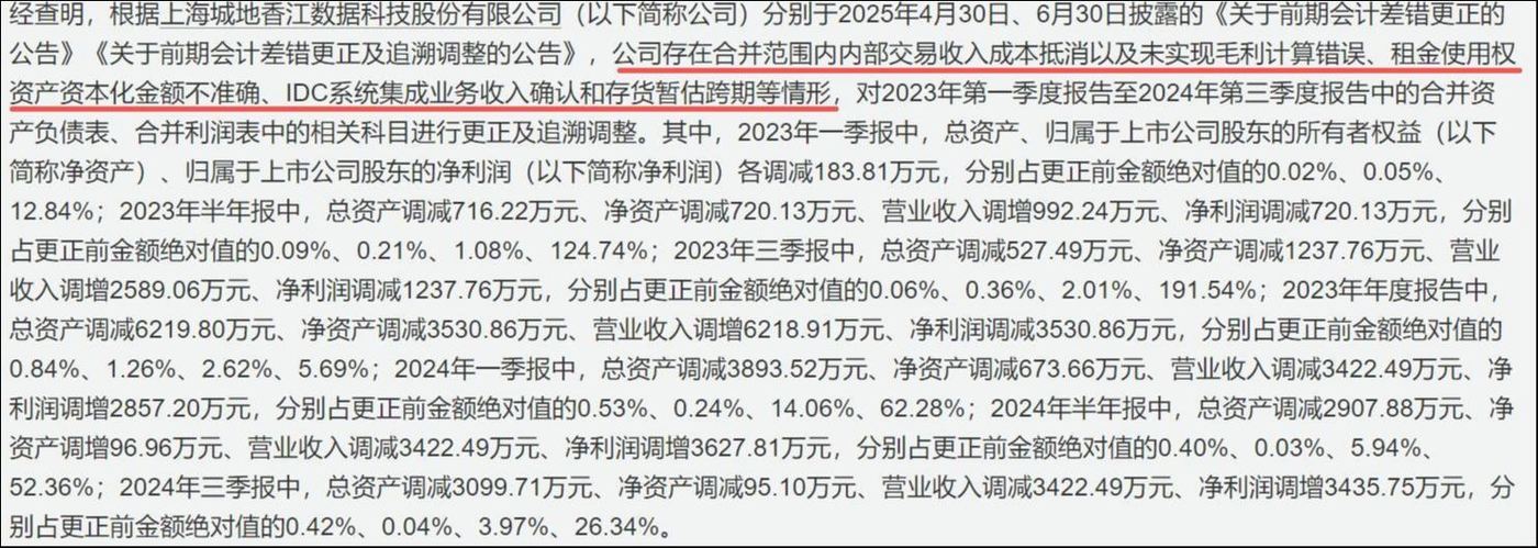 雪上加霜的是,2025 年 9 月,城地香江接连披露两则公告,公司因 2023 年至 2024 年共计 7 份财报信披失真,先后被上交所通报批评,并被上海证监局出具警示函。