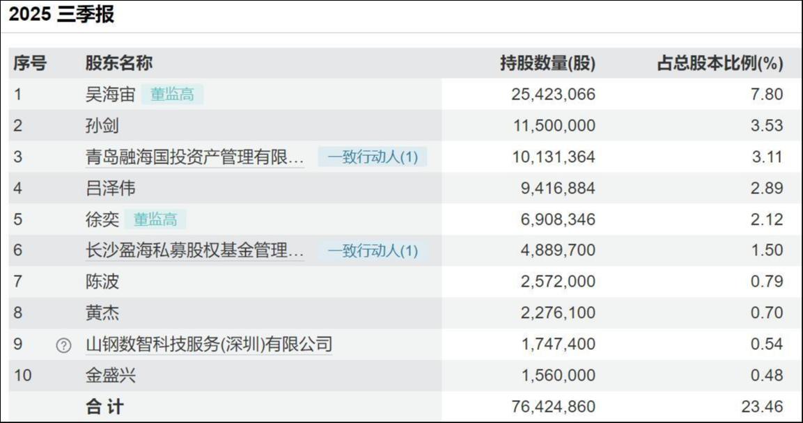 截至 2025 年三季度末,天晟新材无控股股东、无实际控制人,股权结构极度分散。第一大股东吴海宙持股数量为 25,423,066 股,持股比例为 7.80%,前十大股东合计持股比例仅为 23.46%,缺乏任何主导性力量。