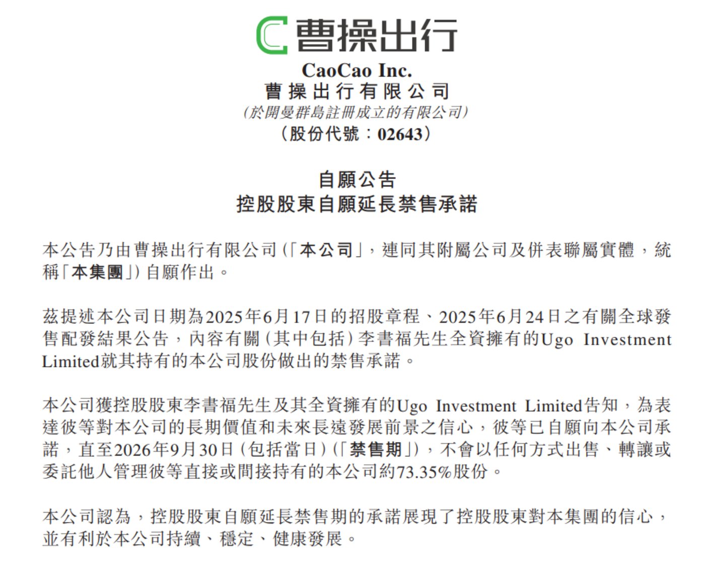 值得一提的是,在收购官宣不久后,曹操出行控股股东李书福还释放了更积极的信号。其发布了一份公告,承诺至 2026 年 9 月 30 日 (包括当日),不会以任何方式出售、转让其当前直接或间接持有的公司 73.35% 的股份。