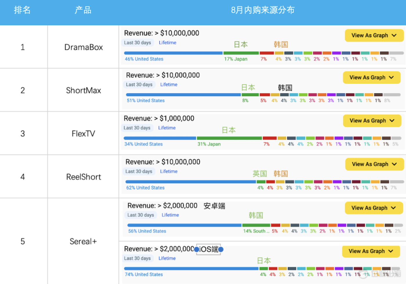 日本收入 Top5 的出海短剧产品及其收入分布|数据来源 AppMagic