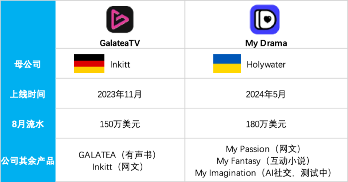 另外一个有趣的趋势是,更多海外厂商打造的短剧出海产品出现在了榜单中,由德国厂商打造的 GalateaTV 和乌克兰厂商打造的 My Drama 双双突破了百万美元的月流水。在这两家厂商身上我们又再次看到了熟悉的网文业务起家的背景,而且相较于我们上次的观察,两款海外厂商的产品也更对味儿了,除了更多海外本土剧的上线,两款产品也正积极引入中文翻译短剧来填充内容库。