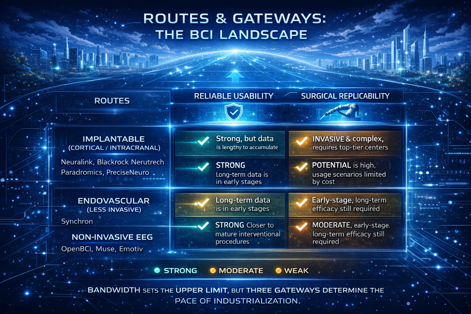 在脑机接口产业化的赛道上,不同公司选择了不同的技术路线,并在各自的领域内寻找突破。我们可以根据三道门框架,重新评估这些公司如何攻克产业化难题。