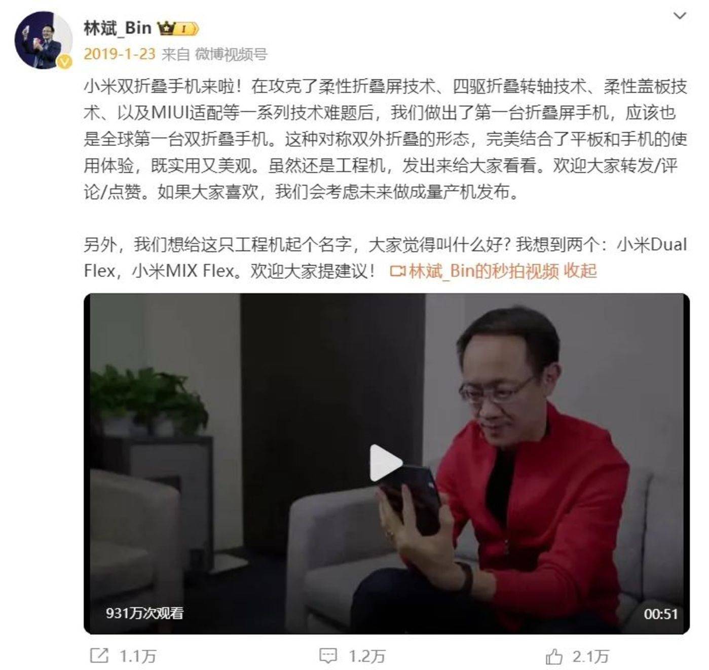 1 月 23 日午后,小米联合创始人兼时任总裁林斌在微博上发布了一个视频,宣布小米攻克了柔性折叠屏技术、四驱折叠转轴技术、柔性盖板技术等一系列难题后,做出第一台双折叠手机。他特意声明,这是一台工程机,只是发出来给大家看看,将会根据大家的喜爱程度考虑是否做成量产手机。