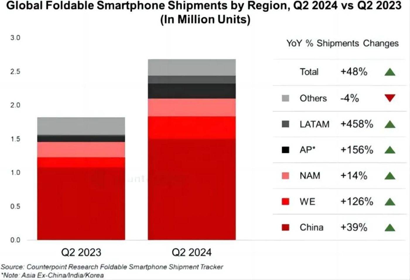 只有大厂有能力搅动更强烈的风暴。如今,以华为为代表的中国手机厂商,正在全球折叠屏市场扮演更重要的角色。市场研究机构 Counterpoint Research 在最近发布的报告显示,全球折叠屏智能手机在 2024 年第二季度同比增长 48%,其中,中国品牌持续引领增长,占总出货量超过一半。