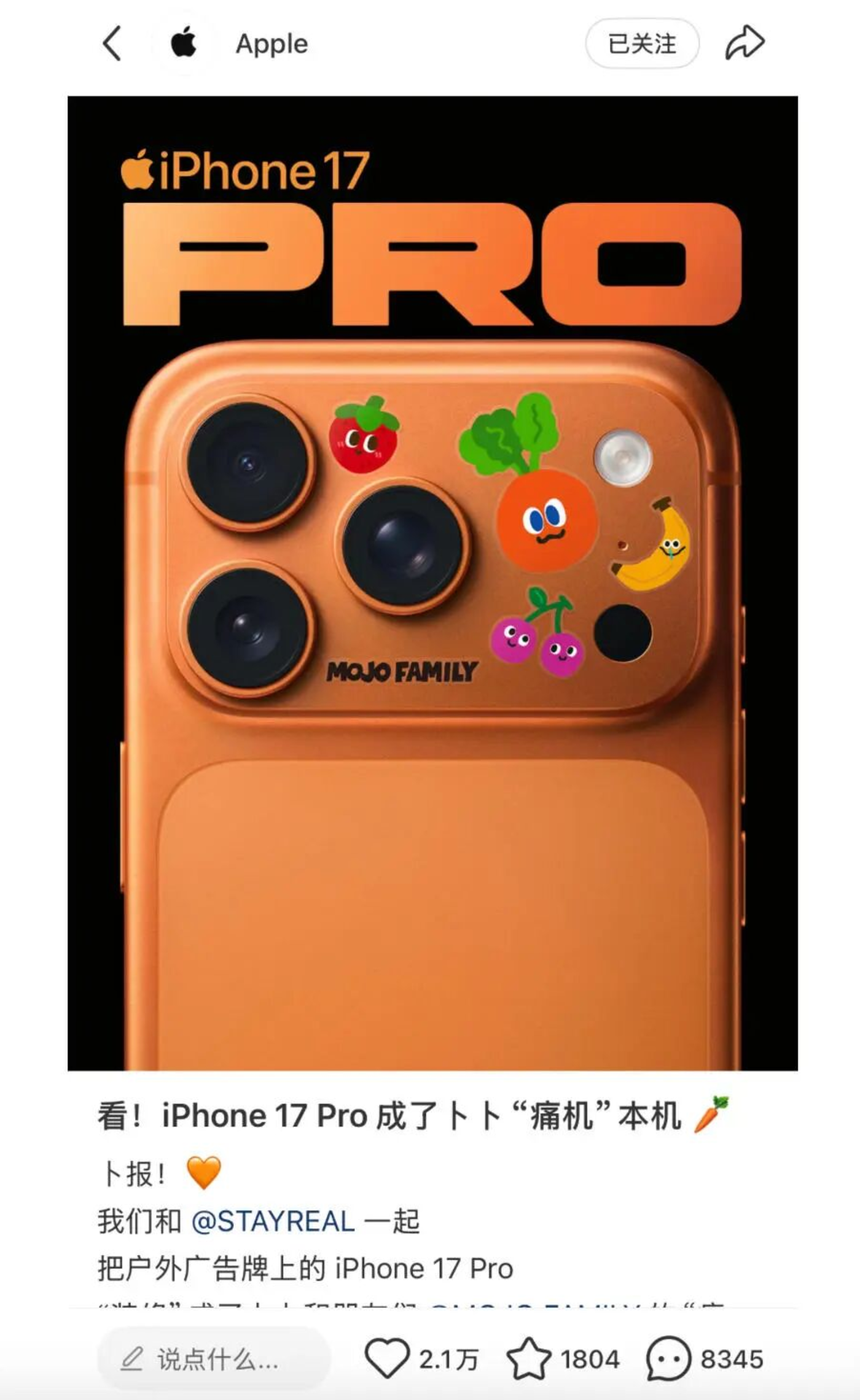 iPhone 17 Pro 与阿信主创潮牌 IP MOJO FAMILY 的联名