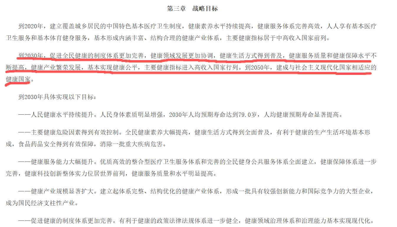 中共中央、国务院发布的 《“ 健康中国 2030” 规划纲要》 提出,要以人民健康为中心,通过政府主导、社会参与,将健康融入所有政策,推动卫生工作从治病转向预防为主、防治结合;到 2030 年,促进全民健康的制度体系更加完善,健康生活方式得到普及,健康服务质量和健康保障水平不断提高,健康产业繁荣发展。