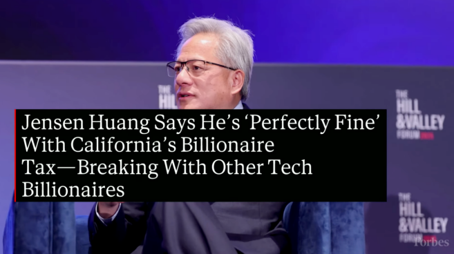 黄仁勋在接受电视台采访的时候被问到“ 加州新富人税” 的问题,满不在乎地说:“ 我们选择在硅谷,他们想征收什么税,我们就交什么税。”