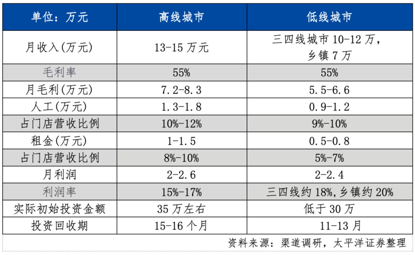 当门店平均月利润只有 1 万的时候,高线城市月收入不到 9 万,低线城市不到 5 万,整体投资回收期约为 3 年,是单店模型恶化的转折点,自此行业增速将大幅放缓甚至回落。