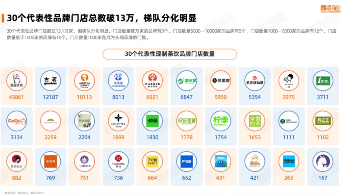 截至 2025 年,全国 (不含港澳台) 现制茶饮门店总量已突破 41.5 万家,全国 30 个代表性现制茶饮品牌门店总量已突破 13.1 万家。头部品牌 「巨无霸」 效应显著,蜜雪冰城以 4.38 万家门店稳居首位,古茗 1.2 万家位列第二,霸王茶姬以 1.01 万家屈居第三。