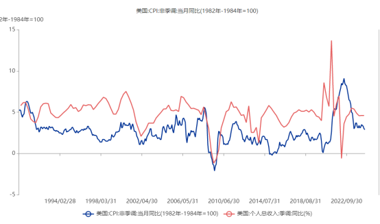 上面的这张图表明,个人收入先上涨,物价随后上涨,经过一轮通胀后进入稳定状态后,收入同比的数据仍然高于物价的同比数据。