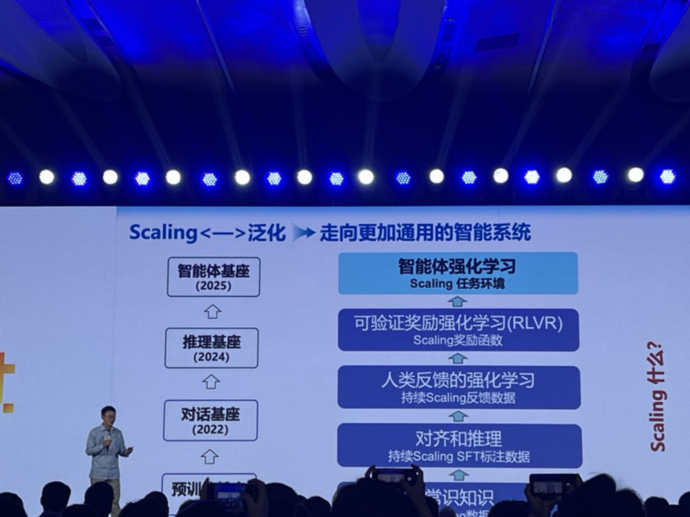 「今年是 RLVR(可验证奖励强化学习) 爆发年。」 谈及 Scaling 模式的进化,唐杰表示,在 RLVR 爆发之前,行业内只能通过人类反馈数据来做,但人类反馈的数据中 「噪音」 也非常多,而且场景也非常单一。「但如果我们有一个可验证的环境,就可以让机器自己去探索、去发现反馈数据,实现自我成长。」