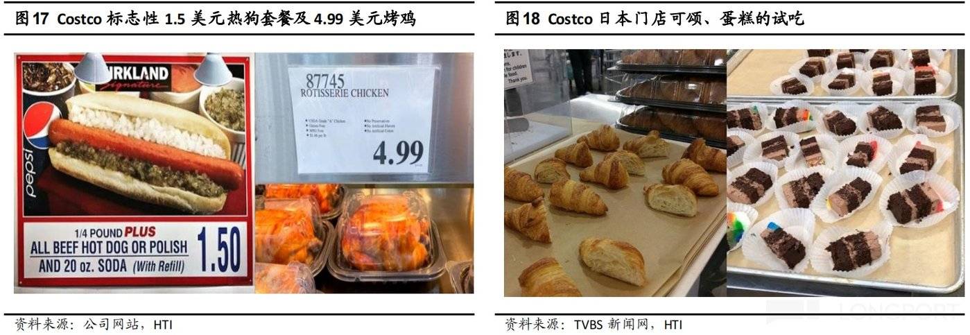 ① 同样高频的加油和餐饮服务,主要是帮助增加消费者的黏性。由于 Costco 门店一般偏远的位置和美国居民汽车出现的习惯,消费者开车到店后加油是自然延伸出的场景。餐饮则是比日常购物更高频的消费场景。极低价的烤鸡和热狗 + 可乐等爆款单品,也确实是 Costco 的引流举措之一。