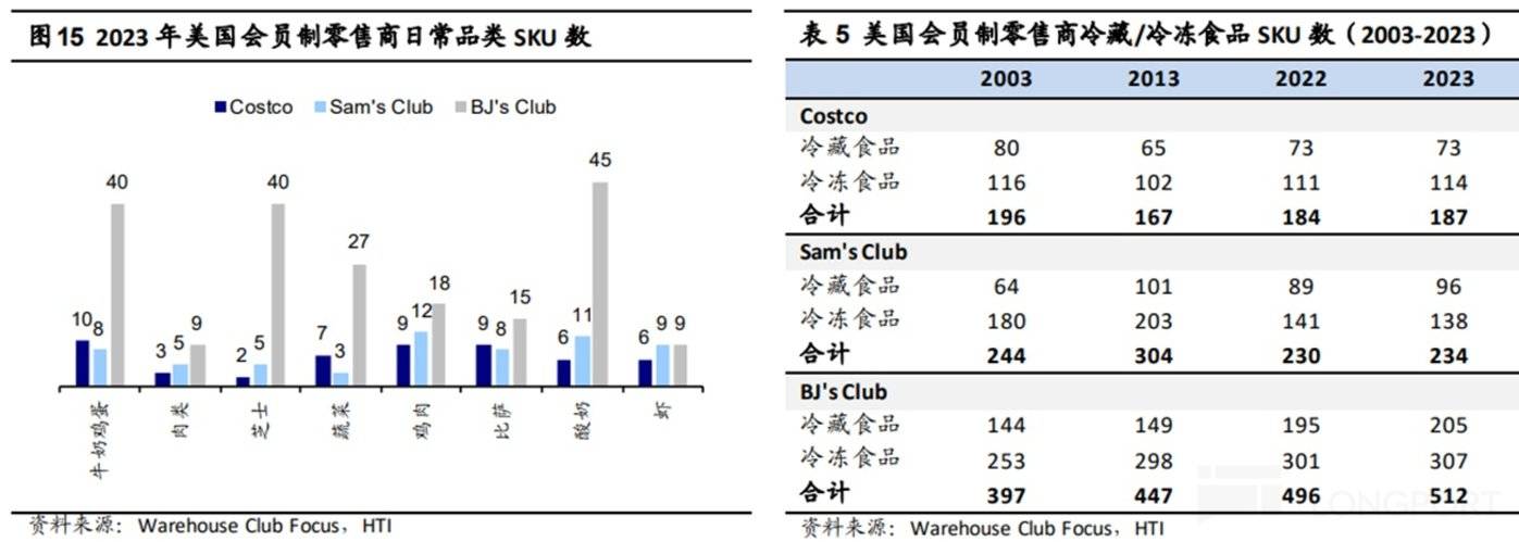 即便是相比同属仓储会员店的 Sam』s 和 BJ『s,Costco 的商品 SKU 也仍是最少的。以生鲜、冷冻食品为例,Costco 的商品 SKU 数量于 Sam』s 大体接近但也少 30%~40% 左右,相比 BJ』s 商品 SKU 属更是精简一半以上。