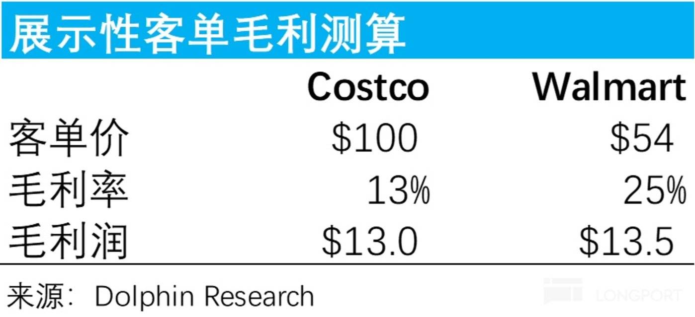 如下表的展示性测算,Costco 和 Walmart 平均从单次用户购物中获取的毛利润额都大约是 $13 左右。此处仅是初步引出此点,关于成本端的会另文再详细讨论。