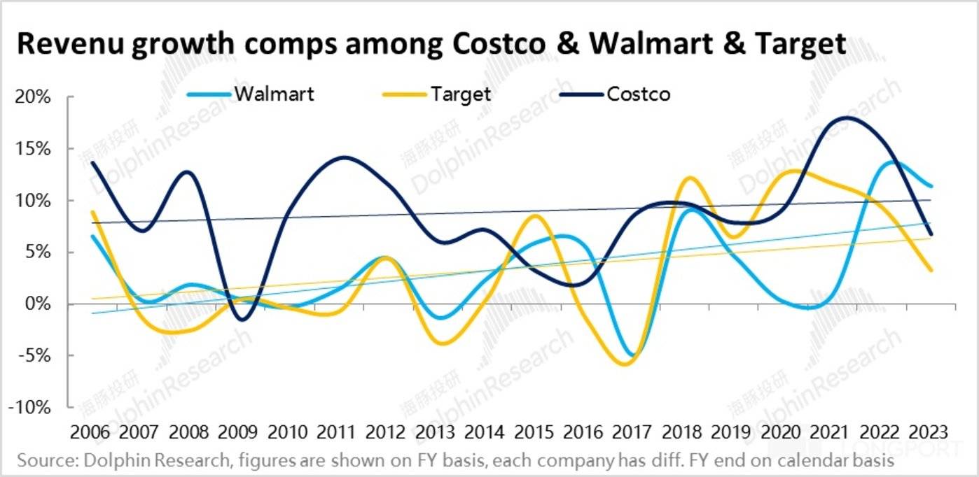 1、2005~23 年近 20 年间 Costco 的营收复合增速为 8.8%,远高于 Walmart 和 Target 同期内仅 3.3% 的增速。在线下零售这个已完全熟透的行业内,Costco 是有着相对更高的成长性。