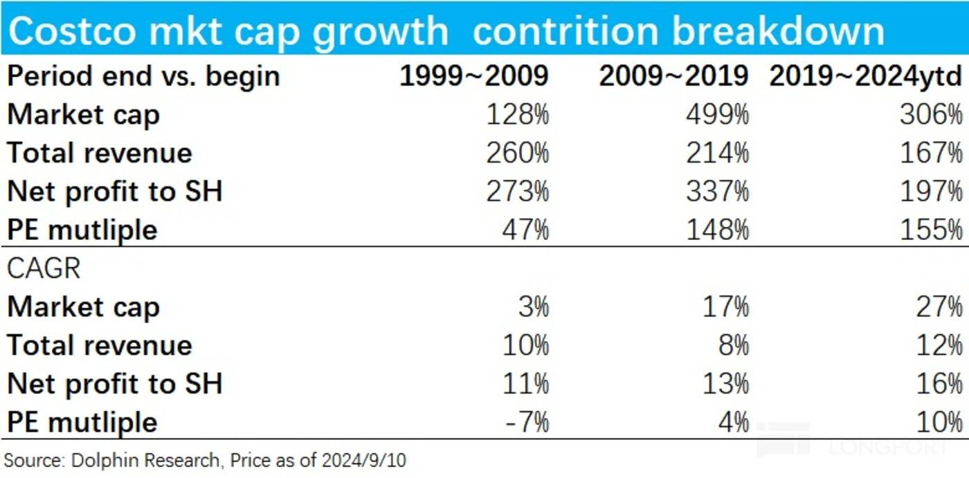 解构 Costco 近 25 年市值约 17x 涨幅的驱动因素,我们以每 10 年作为一个区间,可见: