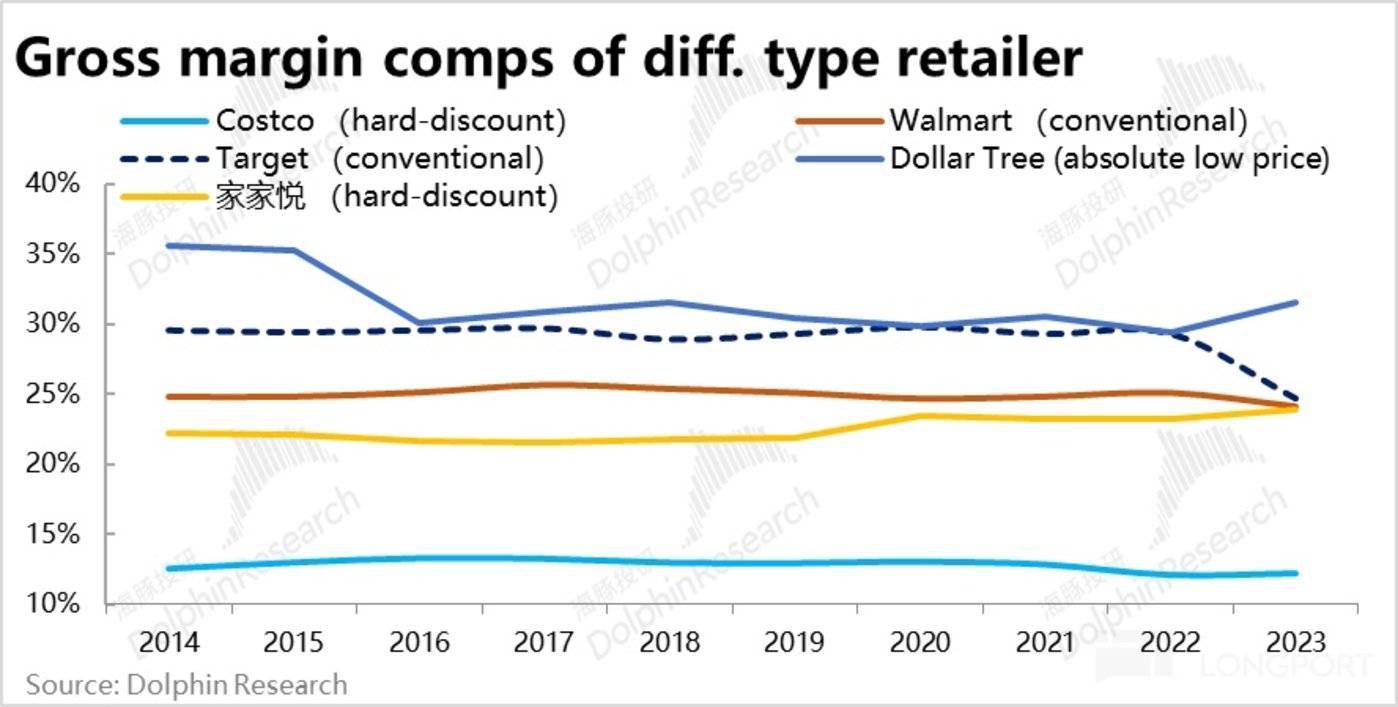 作为验证,Costco 的毛利率十数年一直维持在 12%~13% 的低位,且从未有提升的迹象。明显低于无论常规商超模式的 Walmart 和 Target、还是绝对低价的 Dollar Tree(美版 10 元店)25%~35% 之间的毛利率。清晰体现了 Costco 主动坚守低毛利的抉择。