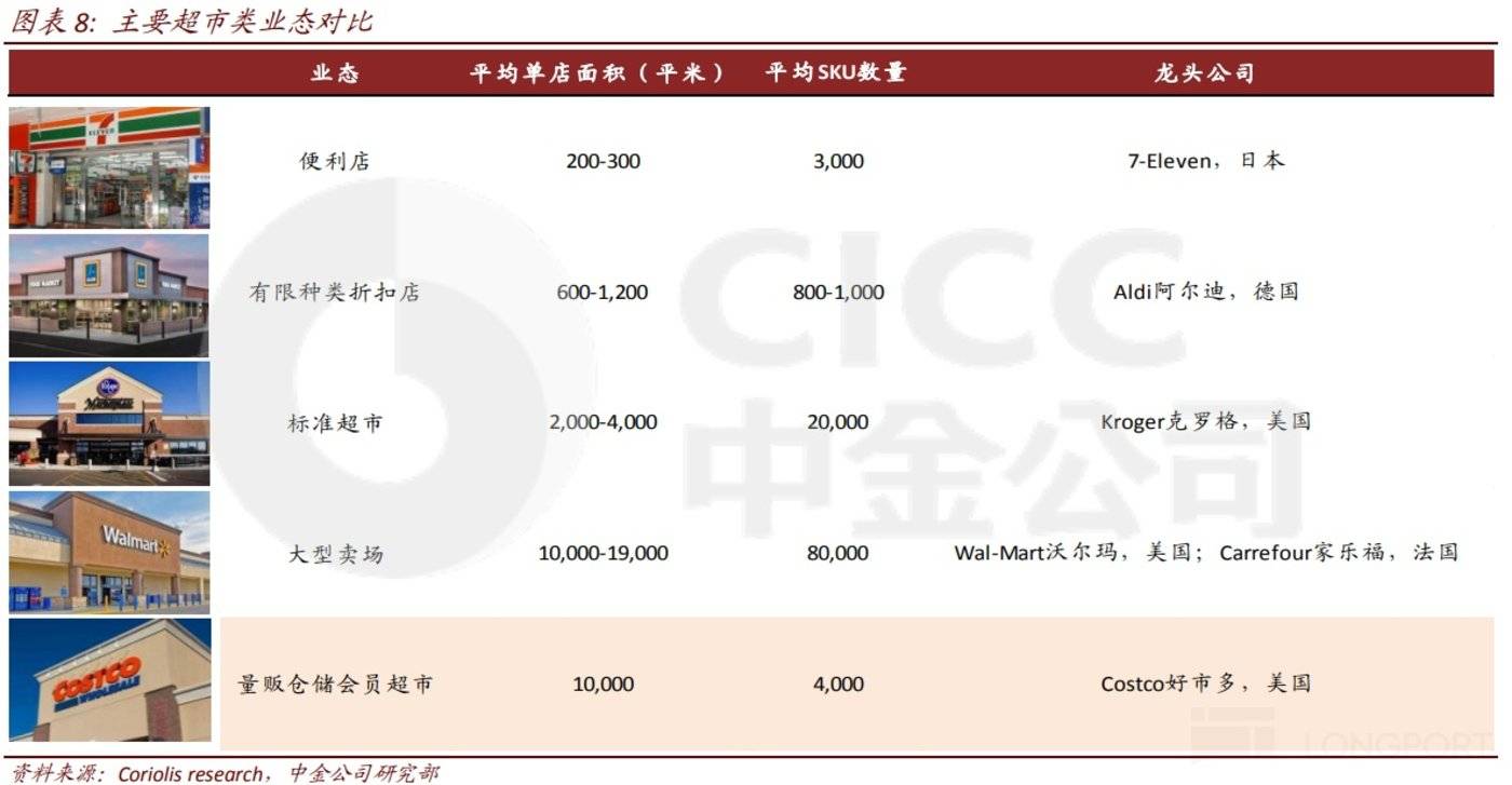 商品 SKU 总数量上,Costco 的选择是 「少」(而精)。以 Costco 为代表的仓储量贩超市,虽也大多位于郊区地带、单店面积较大,但 SKU 数量普遍仅在 4000 上下,远低于常规大型超市 20,000 左右的 SKU 数量。